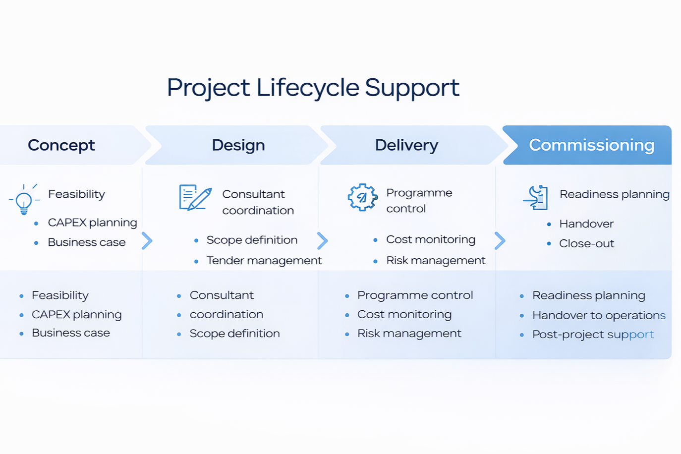 Our team works closely with client stakeholders, engineering teams, consultants and contractors to provide clear project leadership, strong governance and reliable delivery control throughout the project lifecycle.