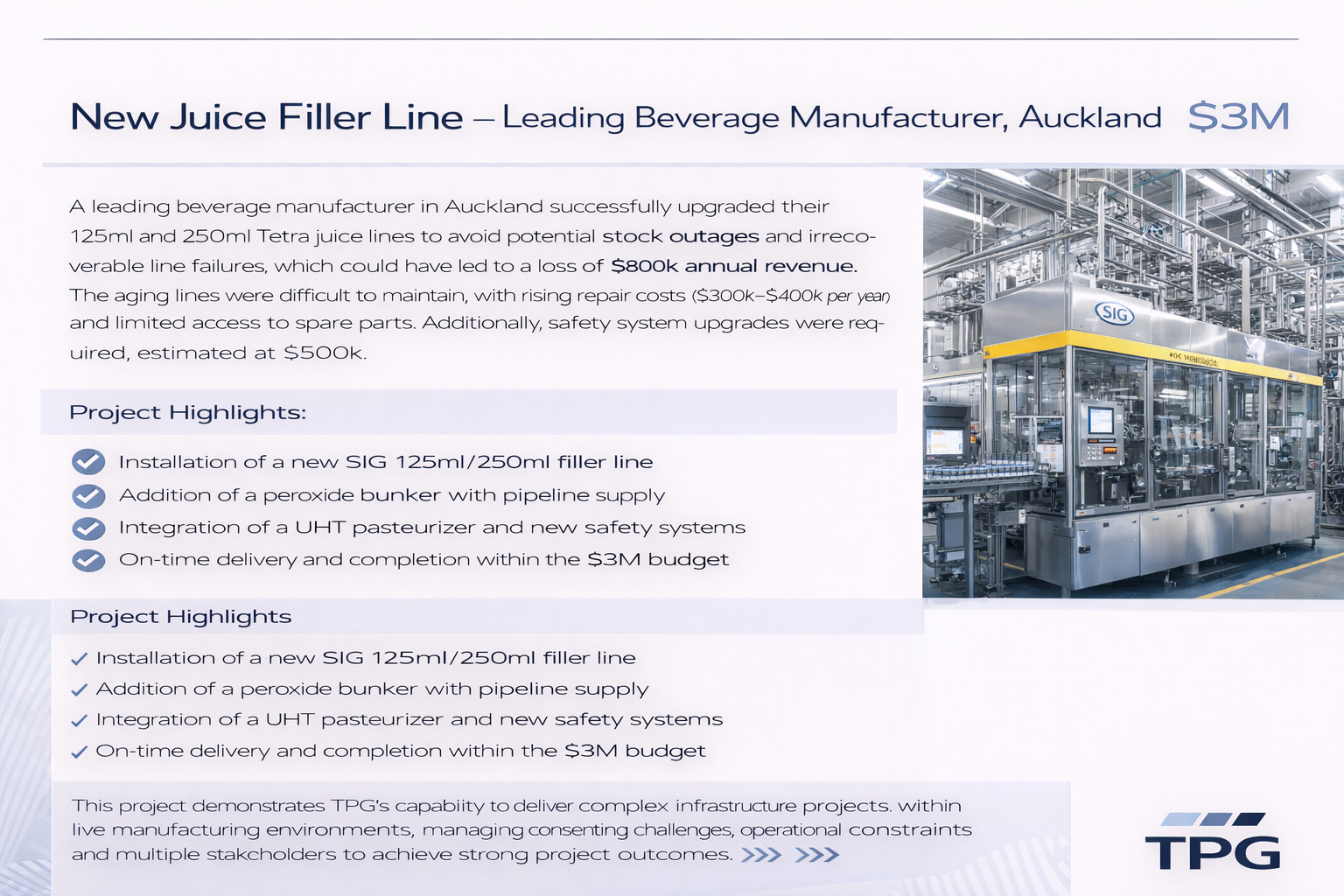 TPG successfully delivered Project Juice Box, upgrading outdated 125ml and 250ml juice box production lines for a leading beverage manufacturer. The aging Tetra Pak lines were replaced with a modern SIG Combibloc filling line and pasteurizer to address supply risks and equipment obsolescence.
